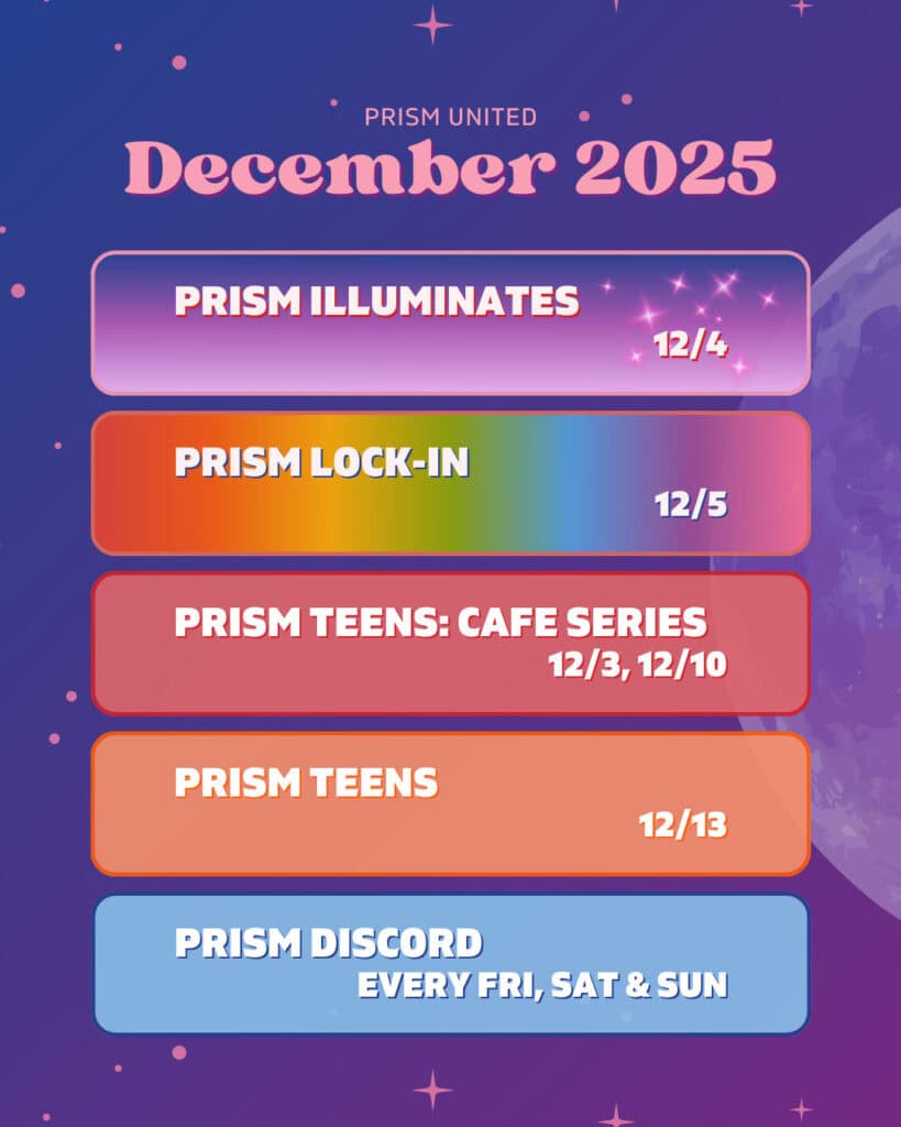This December, while regular Prism Teens programming is on pause, we’re still showing up for youth through our Prism Café Series, virtual gatherings, and our annual Prism Lock-In. These offerings create steady touchpoints for teens to connect, express themselves, and stay grounded in community as the year winds down.
