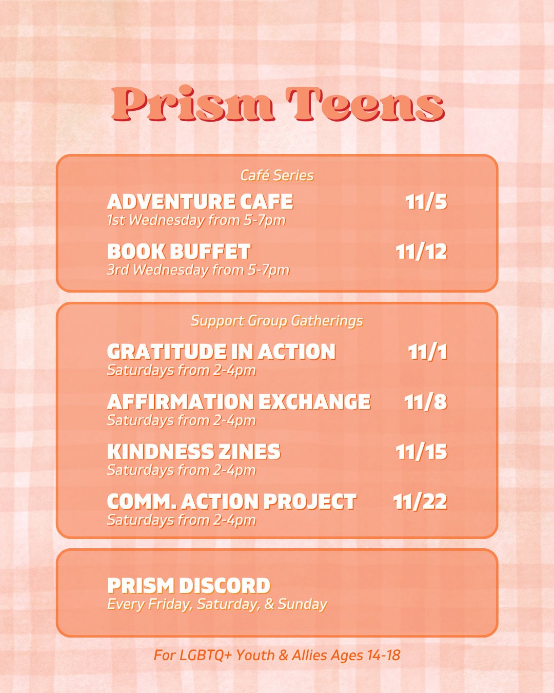 This month, Prism Teens is all about gratitude and giving back! We’ll make art, share kindness, and work together on a fun community project to lift each other up and celebrate what makes Prism feel like home.