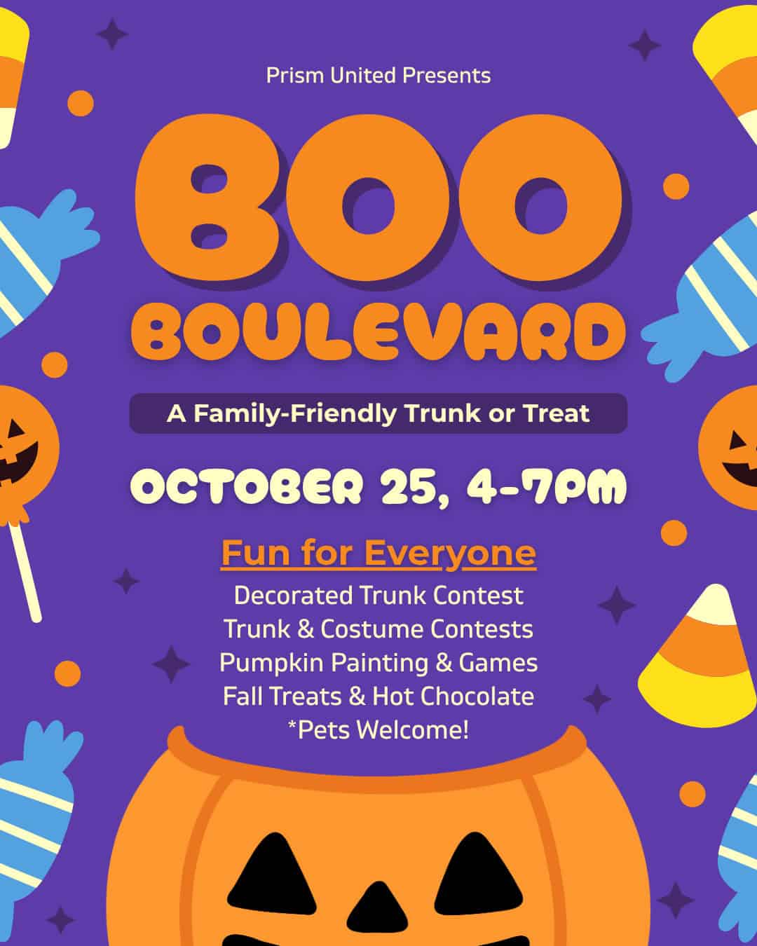 Join us for October’s Prism Families event, ✨ Boo Boulevard ✨, a festive Trunk or Treat happening Saturday, October 25, from 4-7pm. Everyone is invited to attend or volunteer as we line up decorated car trunks filled with candy and fall fun for kids, teens, families, and pets! The evening will also feature festive activities, hot chocolate, and contests, including Best Decorated Trunk, Best Dressed Pet, and Best Costume.